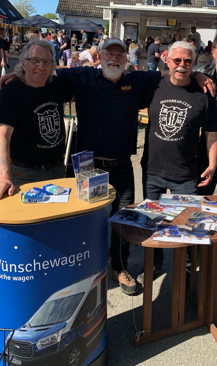 Dass Lisa und ich uns gelegentlich für den Wünschewagen engagieren, war bekannt und so gingen in der letzten Zeit schon einige großzügige Spenden für „Letzte Wünsche-Fahrten“ bei uns ein. Auf diesem Wege ist schon fast eine kleine Patenschaft entstanden. Als dann für den diesjährigen Stapler Markt die Anfrage nach Infomaterial einging, war ziemlich schnell klar, dass beim MC-Zelt ein kleiner „Wünschewagen-Infostand“, „Präsentation“ wie der ASB sagt, eingerichet wird.