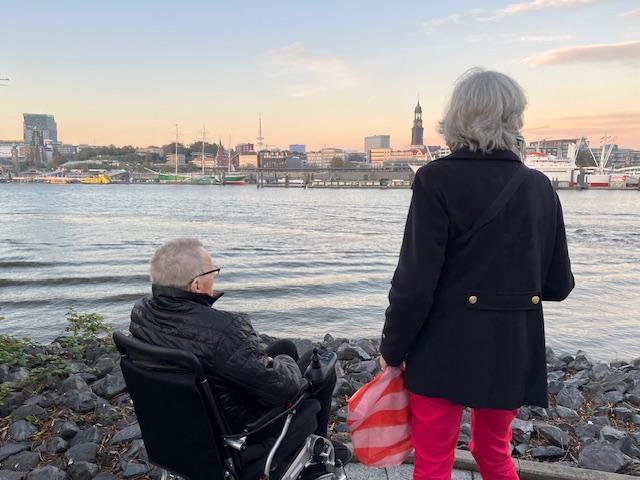 Etwas früher als geplant erreichen wir das Pflegeheim, wo Herr S. schon startklar im Rollstuhl auf uns wartet. Wir überzeugen ihn, die Fahrt gemütlich liegend auf der Trage zu genießen. Da seine Nichte Bettina später dazukommt, setze ich mich zu ihm, und Malte chauffiert uns auf einer schönen Route zurück nach Hamburg. Herr S. ist in gespannter Vorfreude und erzählt mir von seinem bewegten Leben: von Reisen um die Welt, von Jahren in verschiedenen Ländern. Die Fahrt vergeht wie im Flug, denn Herr S. hat viel erlebt und es macht Freude, ihm zuzuhören.