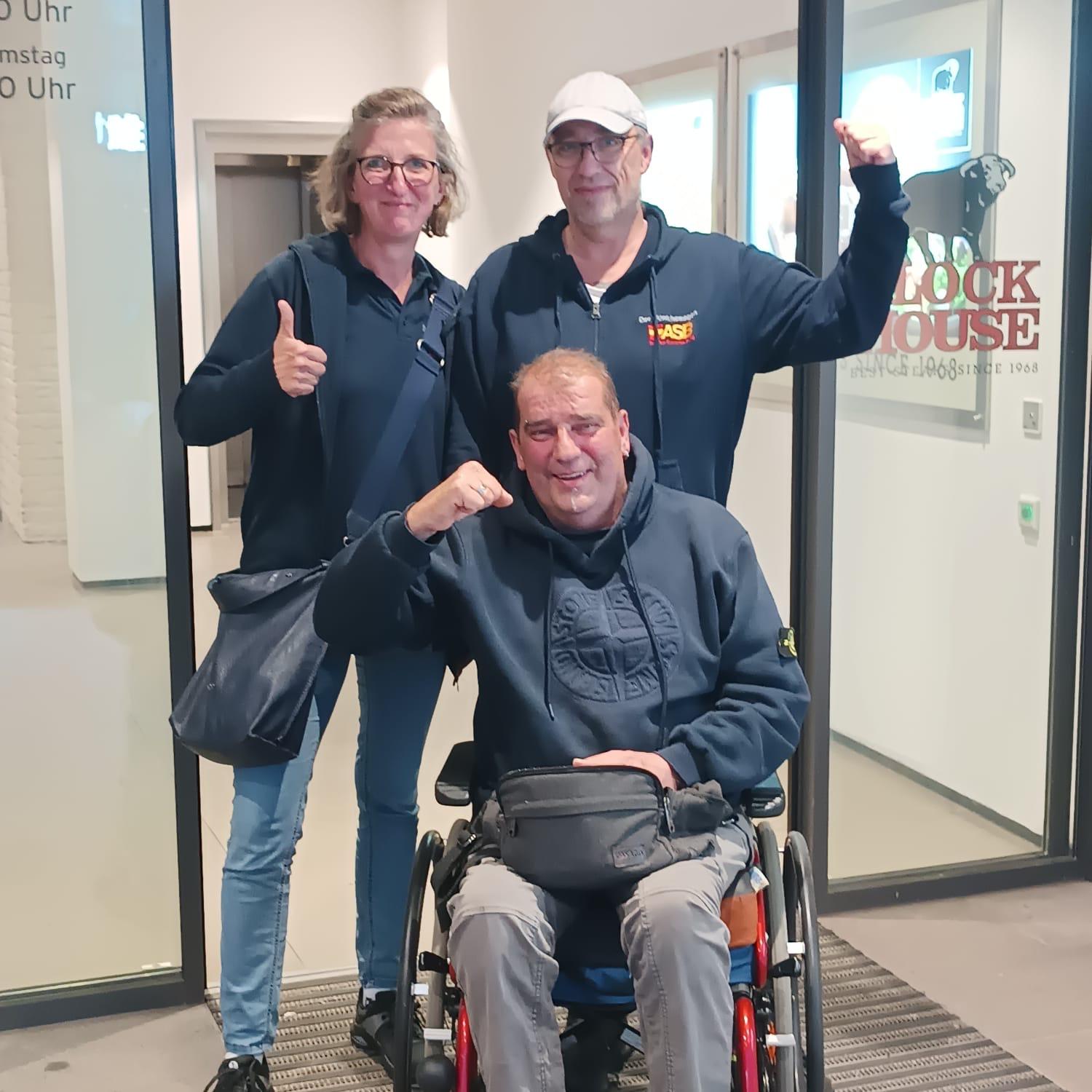 Mit leichter zeitlicher Verspätung haben wir Rigo und seine Frau Gaby am Pflegeheim in Ratzeburg begrüßen dürfen. Aufgeregt und voller Freude warteten sie bereits bei strahlendem Sonnenschein auf uns. Wir einigten uns auf ein unkompliziertes „Du“ und los ging die Reise. Rigo hat auf unserem bequemen Sitz im Auto Platz genommen, sein privater Rollstuhl wurde mitgenommen. Seine Frau Gaby saß ihm gegenüber, und die beiden zwinkerten sich zu. Die Stimmung war fröhlich, aufgeregt und voller Vorfreude auf den Nachmittag und Abend.