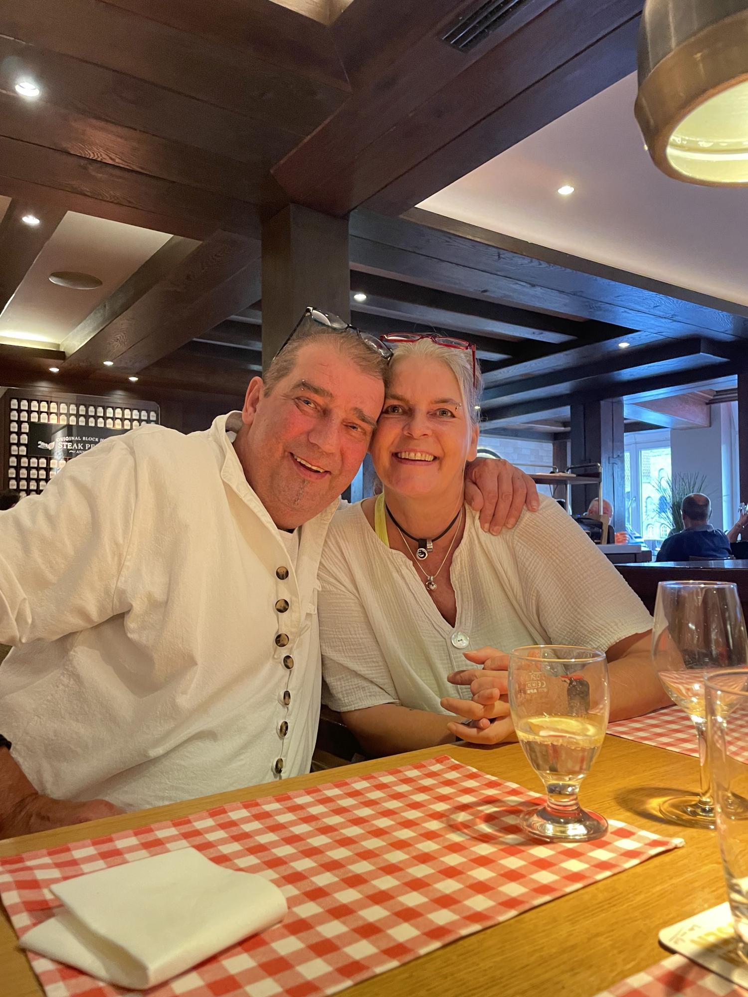 Als erstes Ziel war ein Steakhouse in Lübeck zu erreichen. Bei strahlendem Sonnenschein machten wir einen Spaziergang entlang der Trave dorthin. Rigo, der gelernter Koch ist, freute sich auf ein schönes Dinner. Nach anfänglicher Überlegung, wie viel er schaffen könnte, schaffte er mehr, als er erwartet hatte zu essen, weil es so lecker war.
