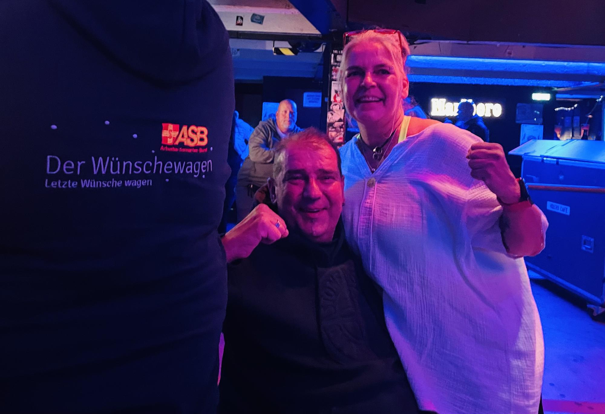 Gut gestärkt ging es zurück zu unserem Wünschewagen, der uns ins legendäre Riders Café brachte. Dort wurden wir schon vom Inhaber erwartet, denn für Rigo und seine Frau sowie uns Begleitende sollte der Einlass vor dem offiziellen Publikum stattfinden. Als Überraschung gab es nämlich noch ein kleines Zusammentreffen mit dem Sänger der Band Kuult! Die Texte der Lieder hatten die beiden durch die schwersten Zeiten gebracht, als unklar war, wie und ob Rigo auf der Intensivstation überleben würde. Es war ein großer Herzenswunsch, gemeinsam das Konzert zu erleben, denn nach fast 30 Jahren Beziehung hatten sie noch nie ein Konzert gemeinsam besucht.