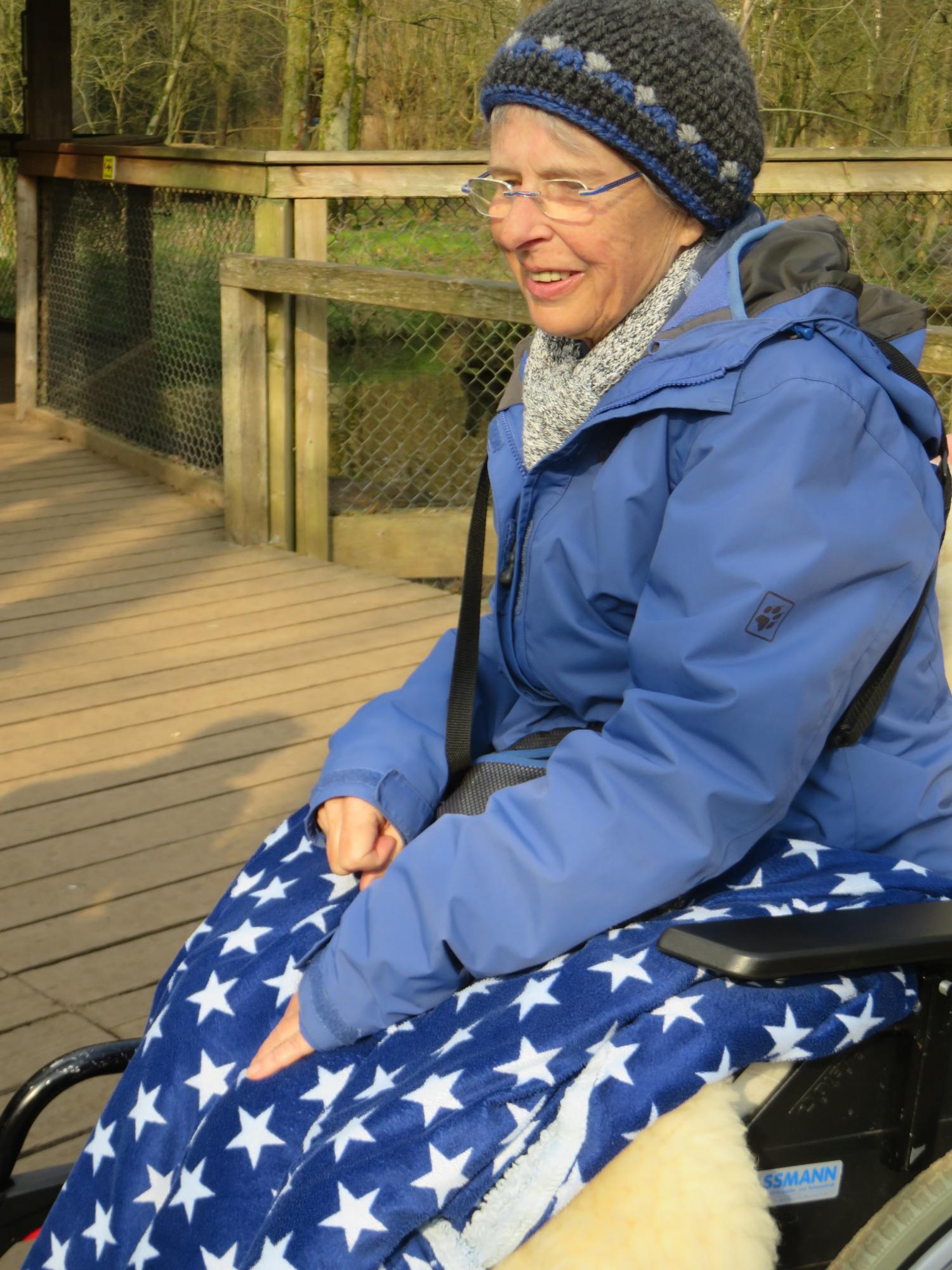 Gabriele, die langjährige Freundin, hatte für Hilde extra ein weiches Schaffell für den Rollstuhl, um ihr den Tag noch angenehmer zu gestalten. Als sie den Wildpark erreichten, war Hilde in ihrem Element. Schon auf dem Weg zur Falknerei begann sie, fröhlich erste Vogelmelodien zu pfeifen, die wir Wunscherfüller:innen erraten durften.