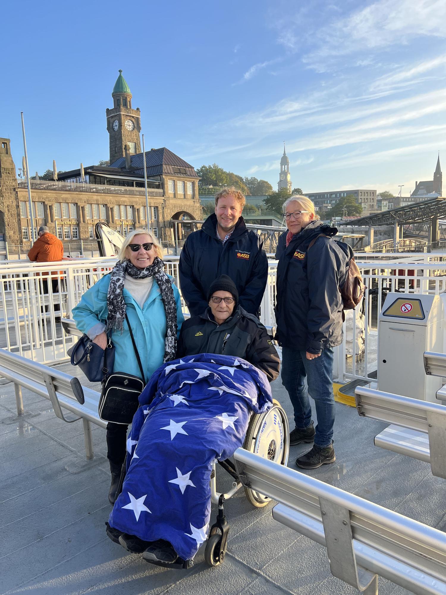 Am Abend erreichten wir bei etwas beruhigter Seewetterlage erst Cuxhaven und dann Hamburg. Unser Wünschewagen hat von der Polizei Hamburg eine Sondergenehmigung für eine Parkplatzbenutzung in unmittelbarer Nähe zu den St. Pauli-Landungsbrücken bekommen, so dass Herr H. und seine Schwester auf den Weg nach Hause nicht lange warten mussten.