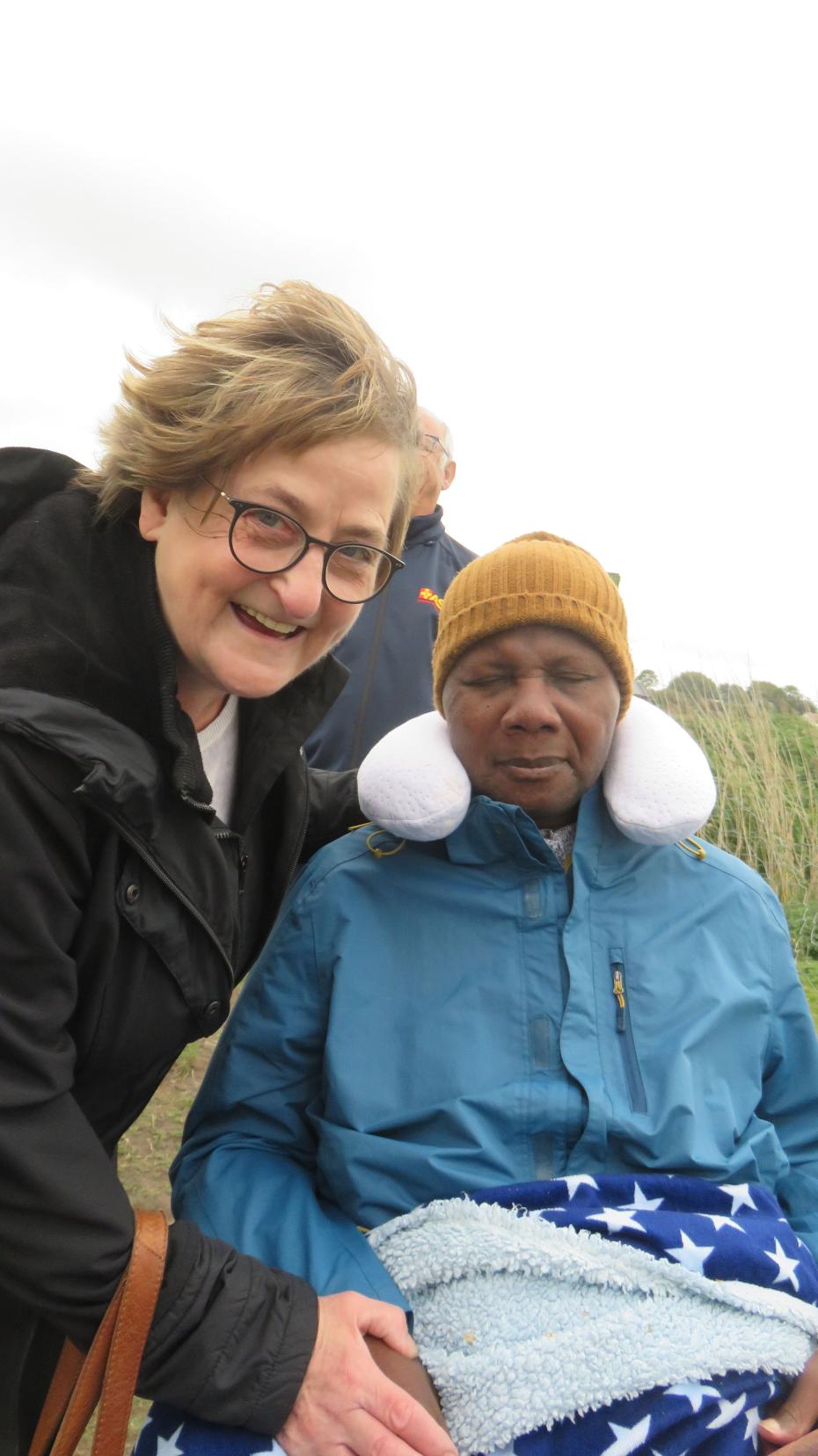 Pünktlich, wie es der Fahrtenplan vorsah, haben wir die Angehörigen Beate und Britta abgeholt und anschließend Kenneth, unseren heutigen Fahrgast. In kurzer Zeit haben wir uns ein wenig ausgetauscht und konnten uns auf die Fahrt einstellen. Kenneth war früher oft auf der Halbinsel Nordstrand und vor kurzem, als er noch reden konnte, äußerte er den Wunsch, auf den Alpaka-Hof und anschließend zum Strand zu fahren. Seine engsten Freunde haben an den Wunsch gedacht und wollten ihn mit uns erfüllen.