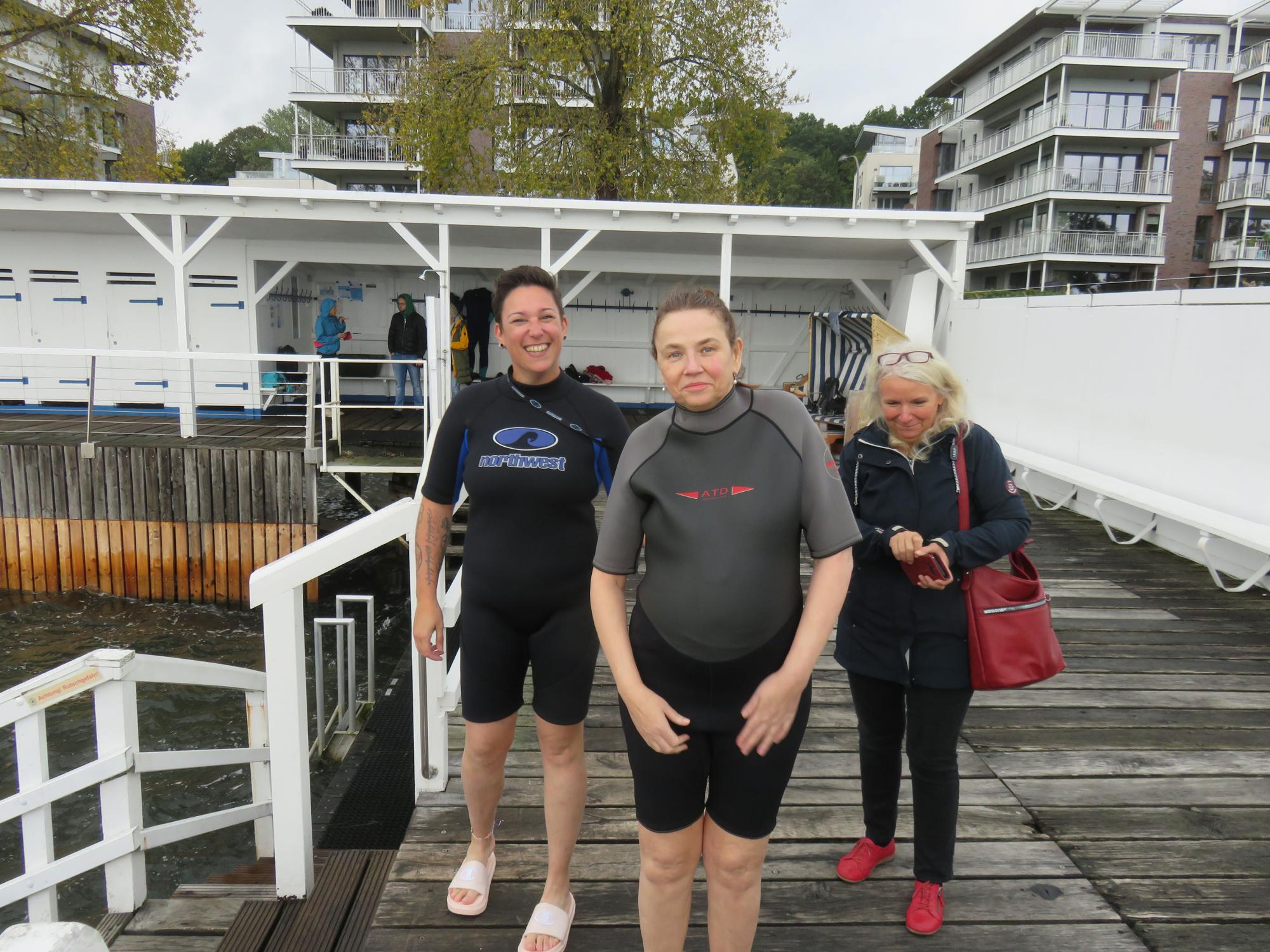 Wir machten uns fertig für die Fahrt, Ivonnes Sohn begleitete sie im Wünschewagen, ihre Freunde fuhren uns hinterher. An der Seebadeanstalt, die eigentlich bereits in der Winterpause ist, wartete Sven mit Neoprenanzügen auf uns. Wir entschieden, dass ich mit Ivonne ins Wasser gehe. Sven hatte auch einen Schwimmgürtel und eine Rettungsboje mitgebracht, beides kam zum Einsatz. Die Worte von Ivonne im Wasser: „Geil, geil, geil….“ Sie erzählte, dass sie ganz oft bei Wind und Wetter schwimmen gegangen ist.